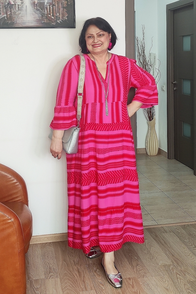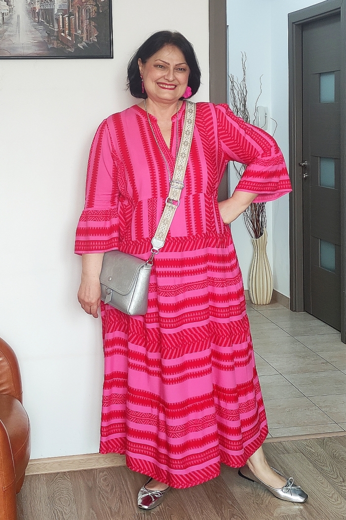 Dacă şi ţie îţi place fuchsia iar ţinutele mele te inspiră, poţi găsi rochia la Bonprix, în gama de mărimi între 34 şi 50, inclusiv pentru lungimea petite (adică pentru siluete scunde).