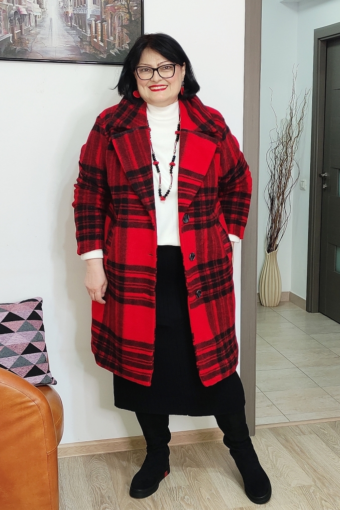 Deşi modelul cadrilat pare să limiteze posibilitatea asortărilor doar la roşu şi negru, lucrurile nu stau aşa. Paltonul merge foarte bine cu denim, cu gri deschis, cu maro ciocolatiu sau cu bleumarin.