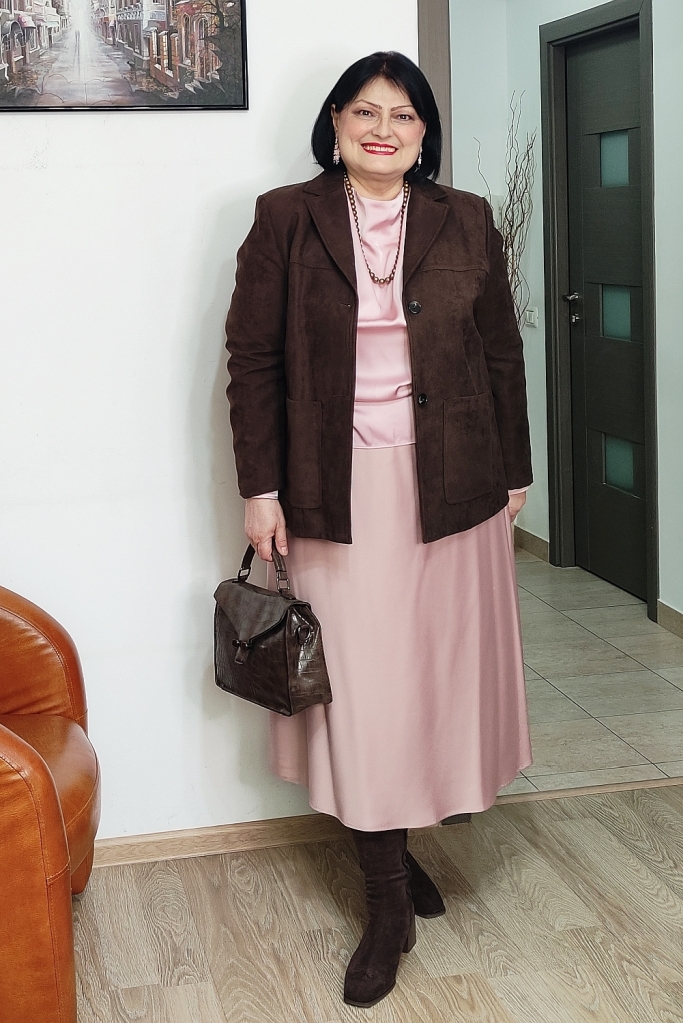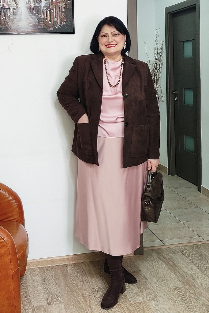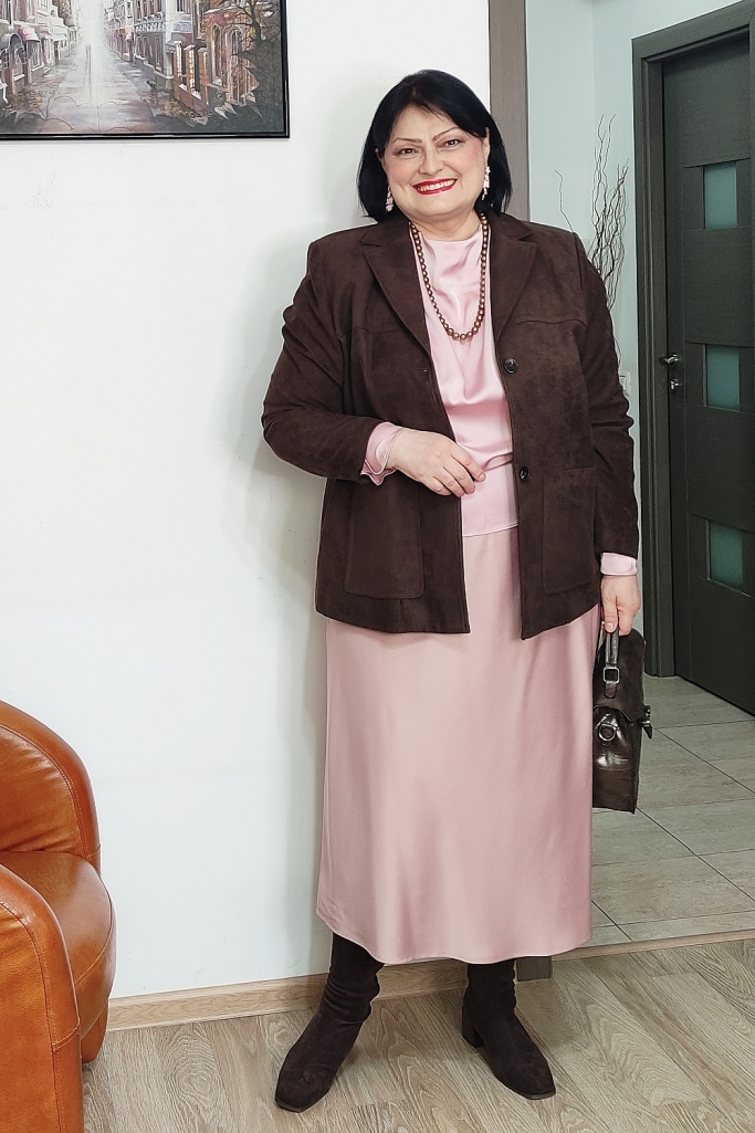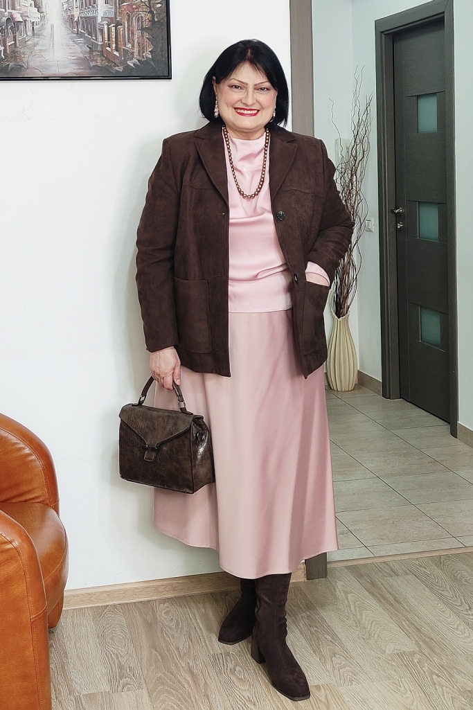 Pe deasupra am îmbrăcat un sacou maro cu textură uşor catifelată, care contrastează discret cu luciul satinului şi adaugă structură şi profunzime ţinutei.
