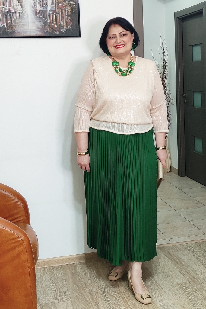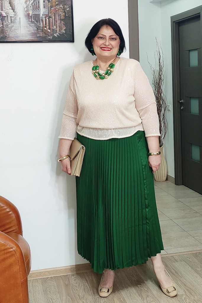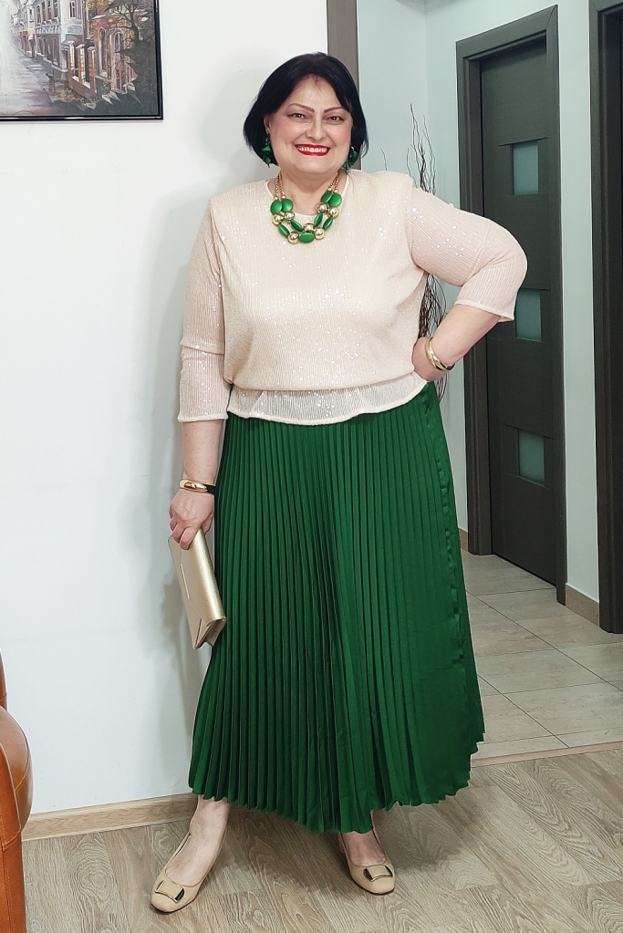 Am purtat o fustă plisată verde, fluidă şi elegantă, într-o nuanţă profundă, asemănătoare bradului de Crăciun.
