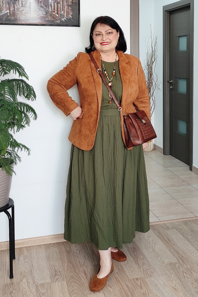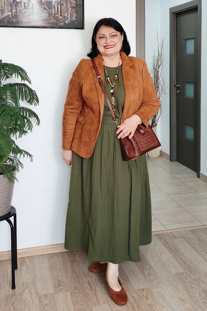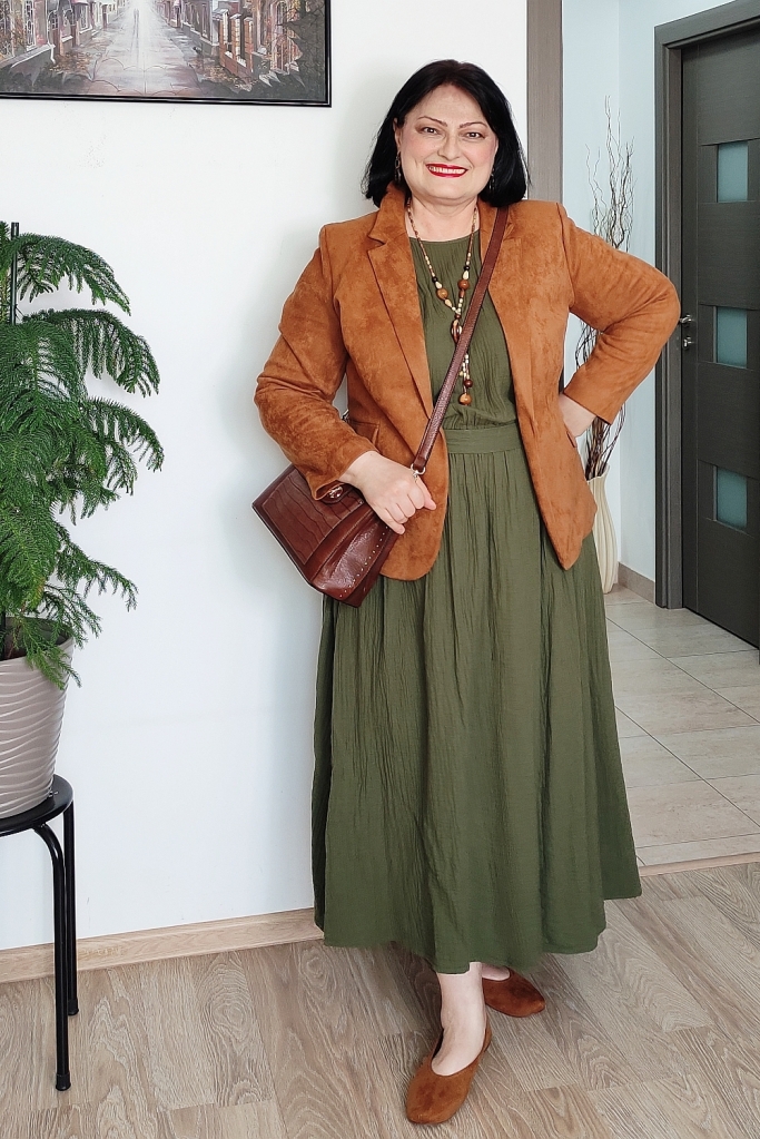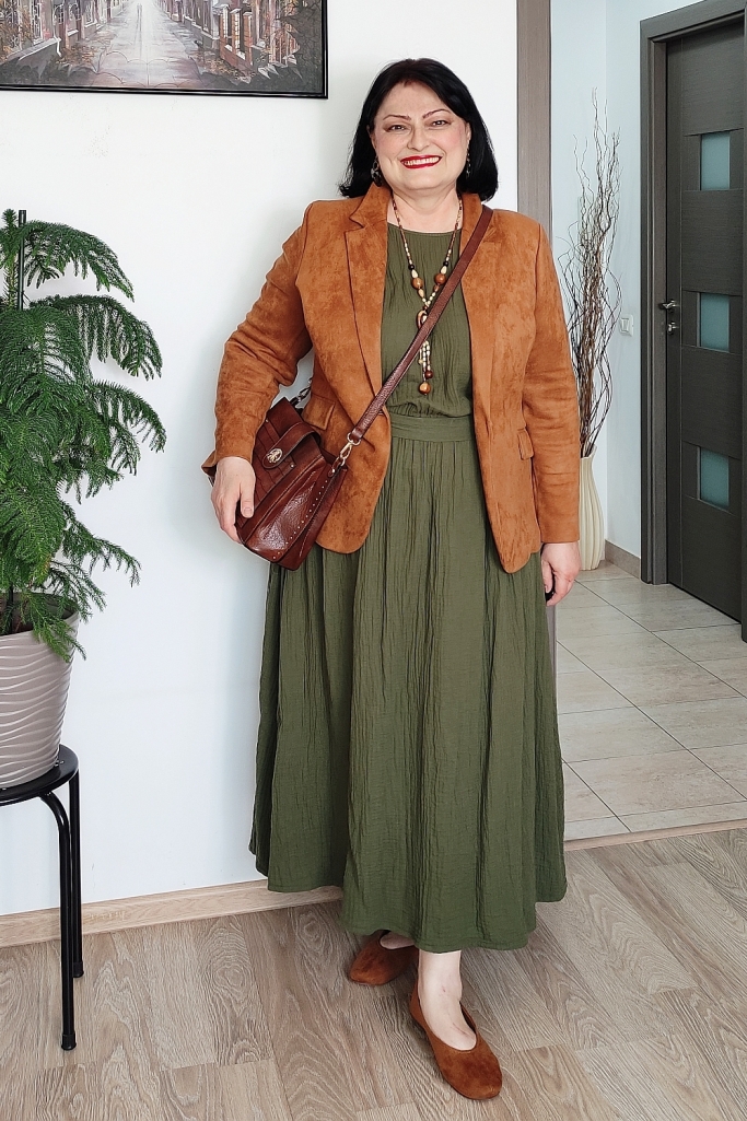 Am profitat de ziua ceva mai caldă de azi şi am ales o rochie din muselină olive, cu textură lejeră și cădere fluidă.