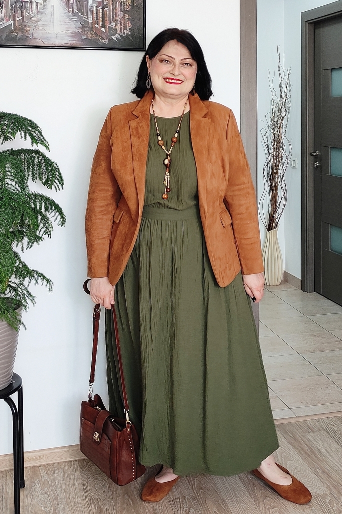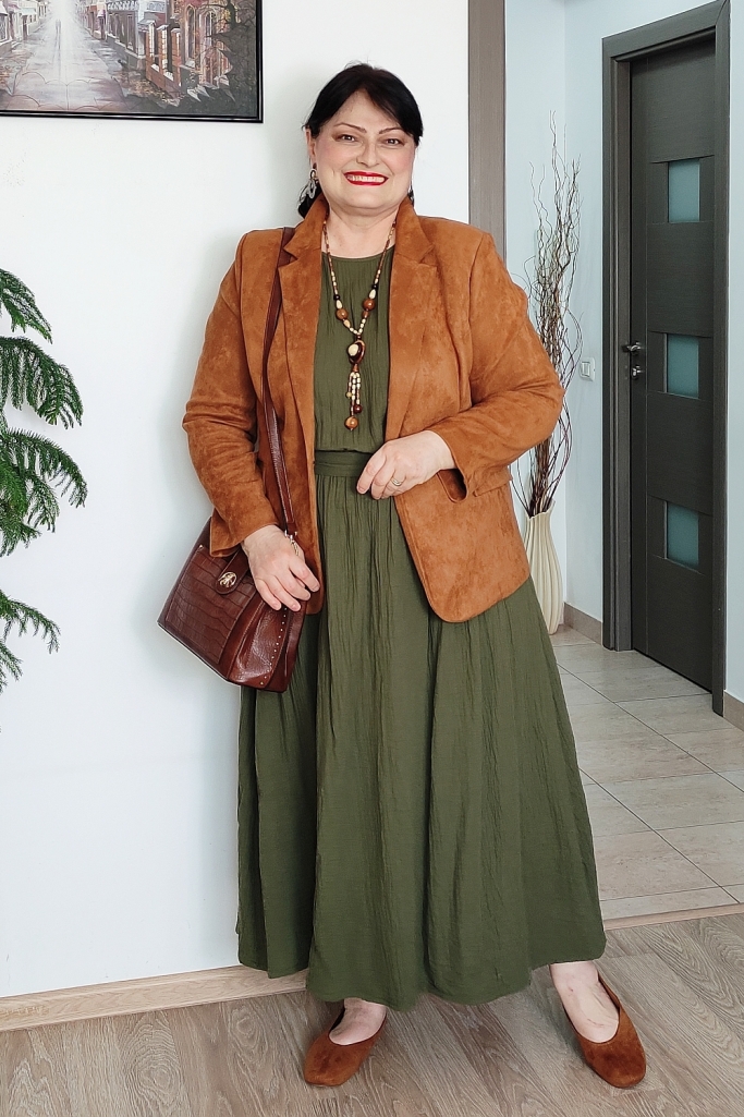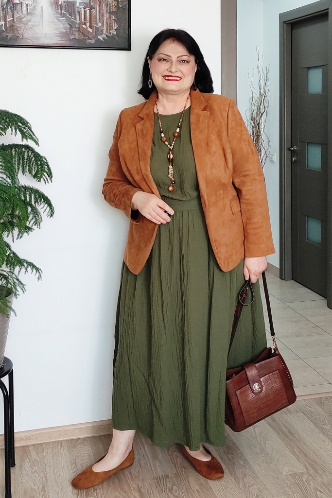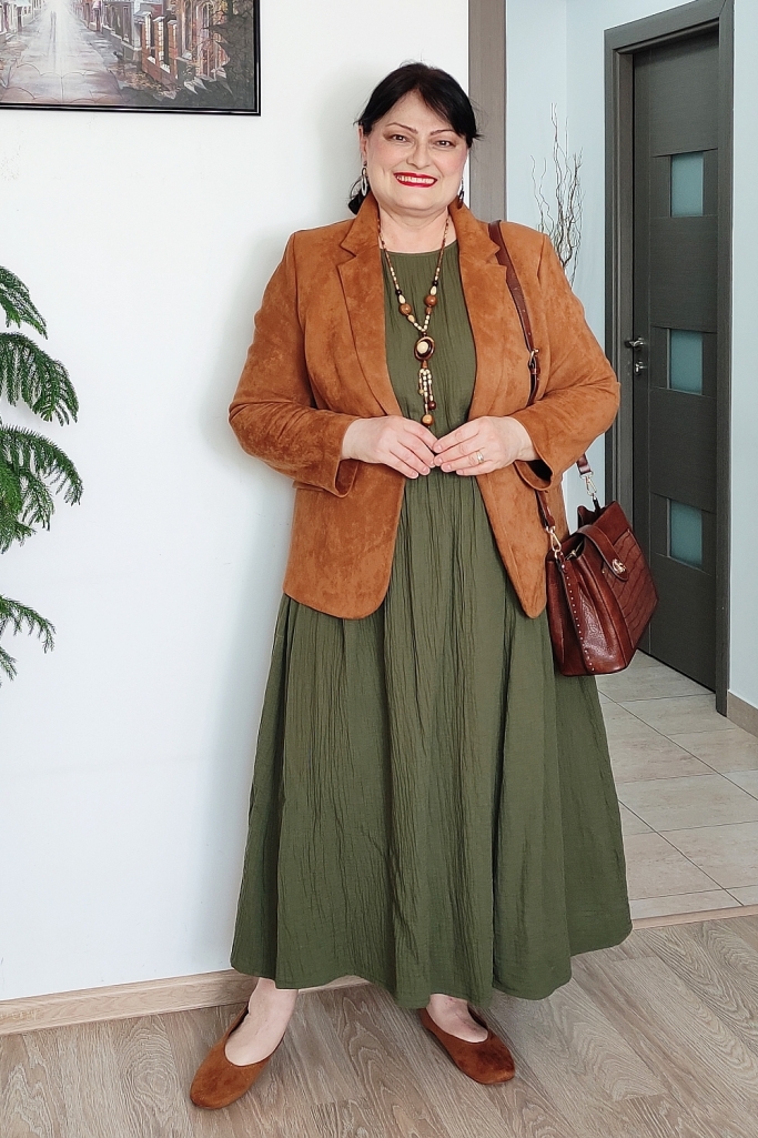 La final am adăugat accesoriile – un colier cu detalii aurii și maronii și cercei asortați – care adaugă un strop de sofisticare fără a încărca ţinuta.