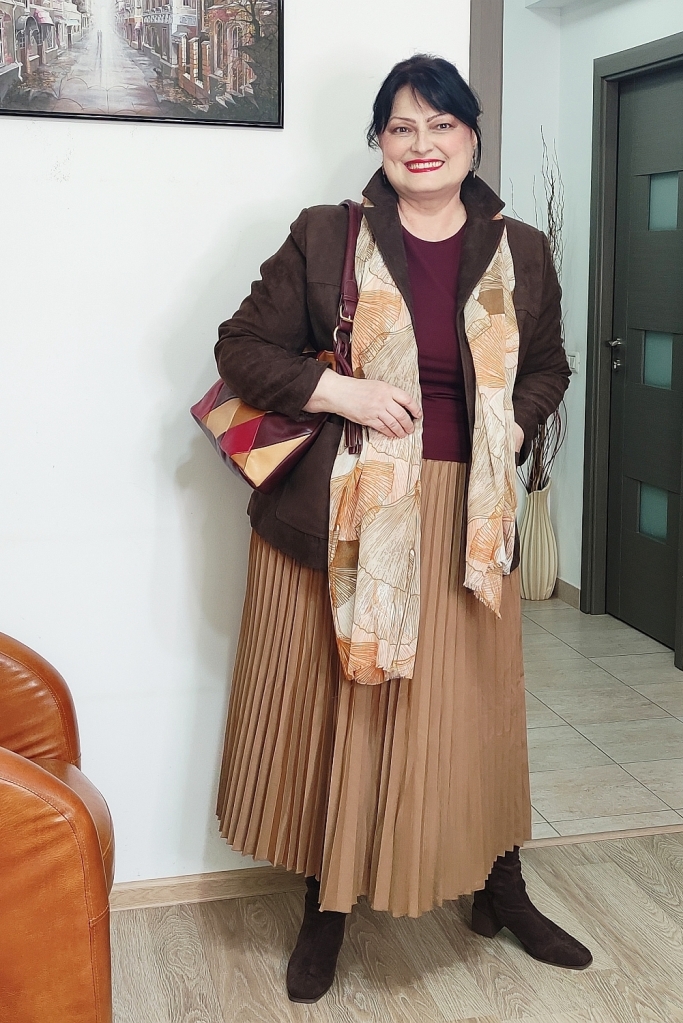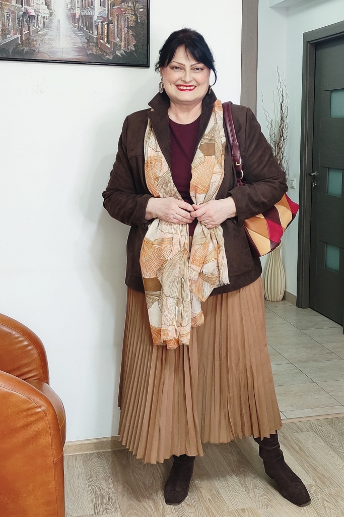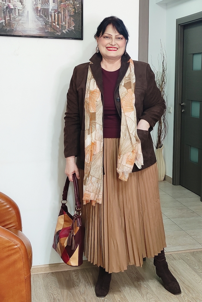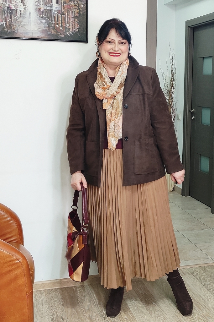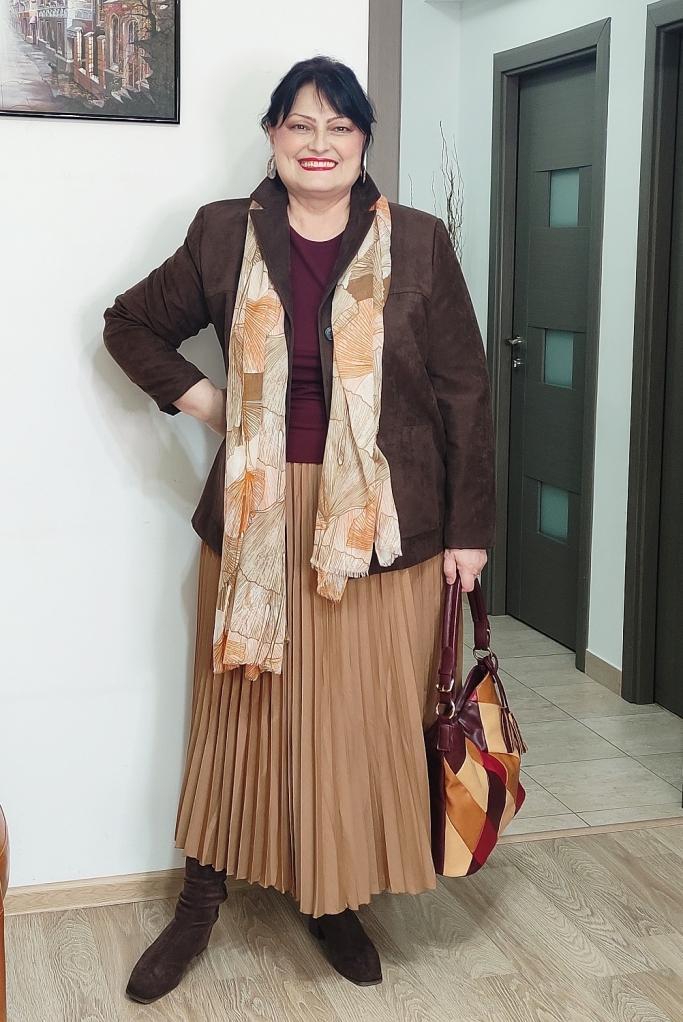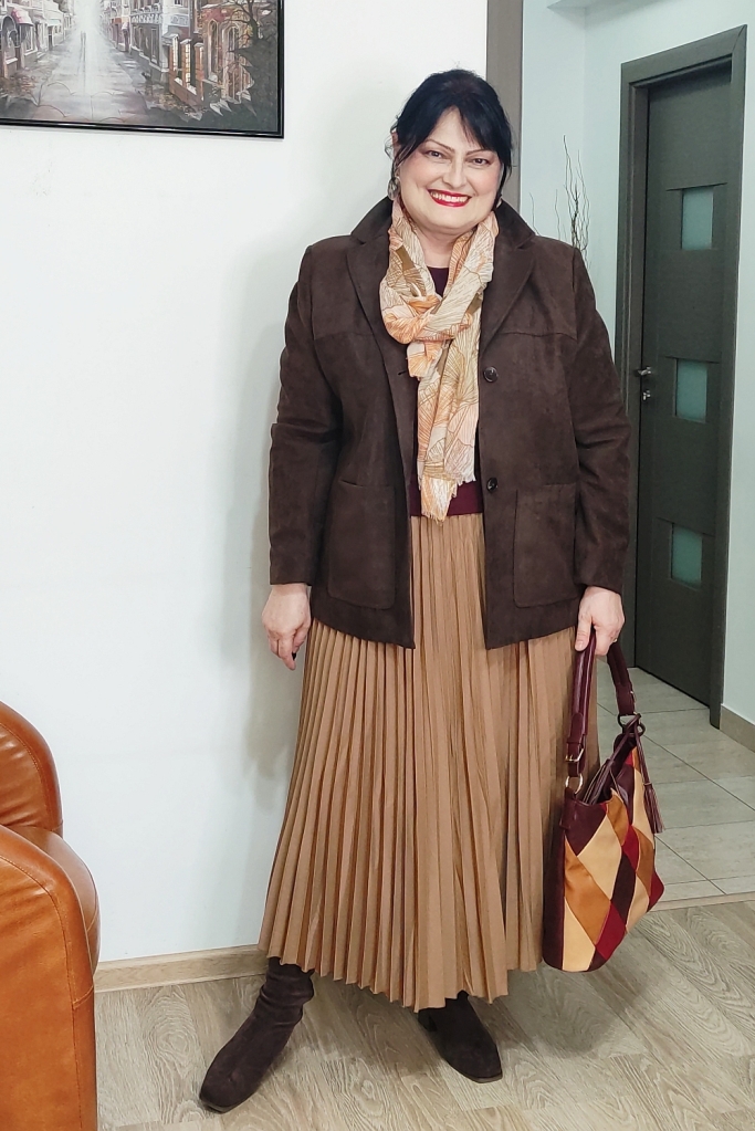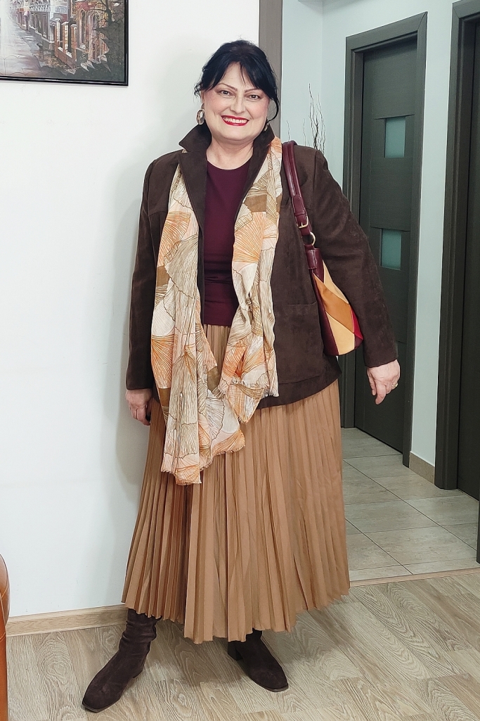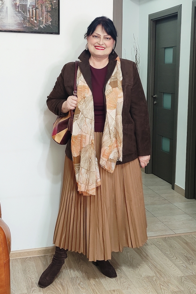 O ţinută cu fustă plisată camel, top bordo şi sacou maro ciocolatiu.