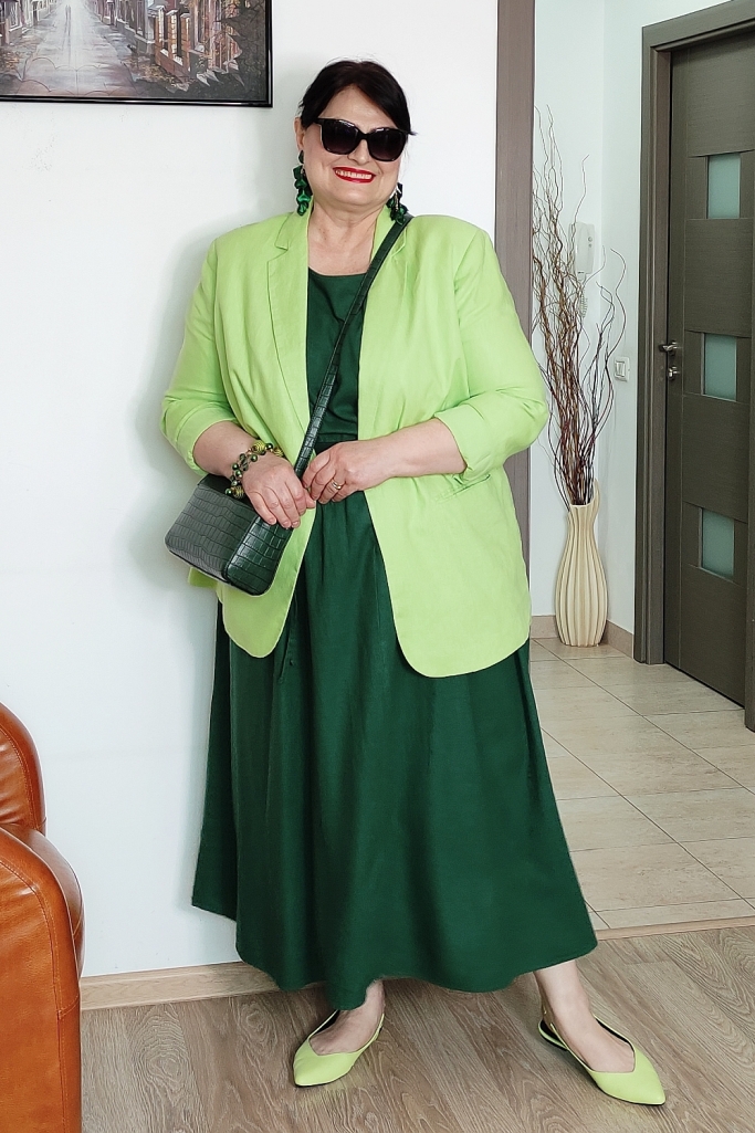 Am purtat o rochie de in într-o nuanţă de verde pădure, peste care am îmbrăcat un sacou, tot din in, verde lime.