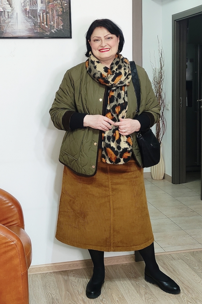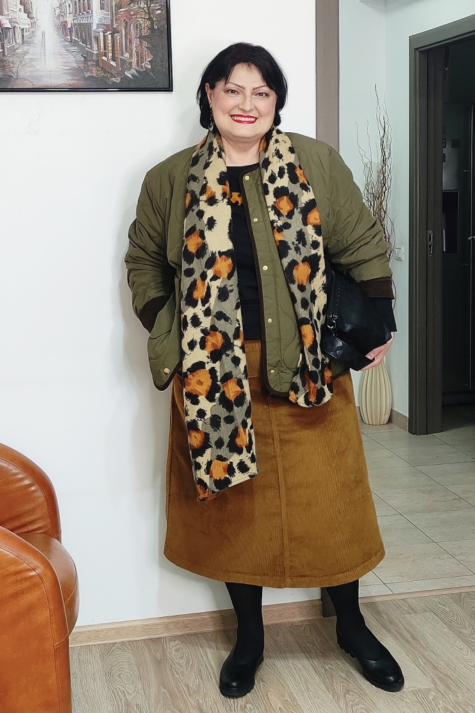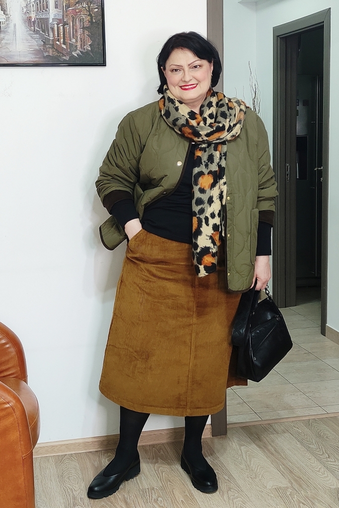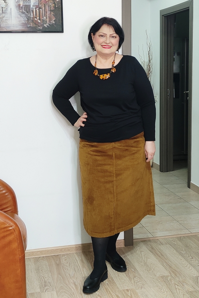 Eu am îmbrăcat o fustă din catifea reiată maro coniac, cu o croială avantajoasă în A, perfectă pentru siluetele pară, cu şolduri late.