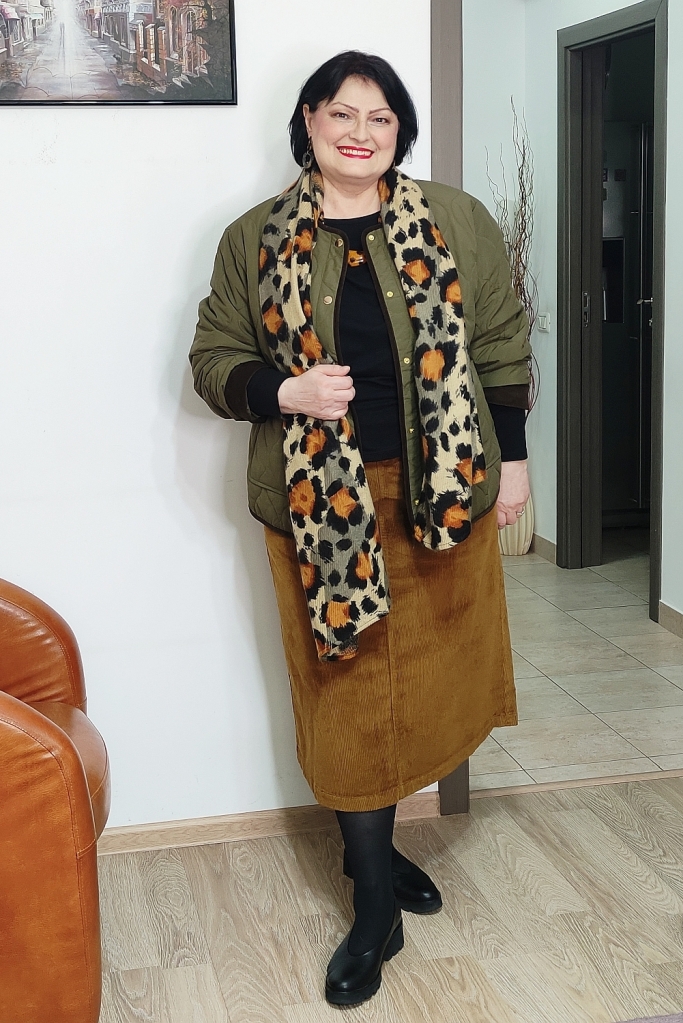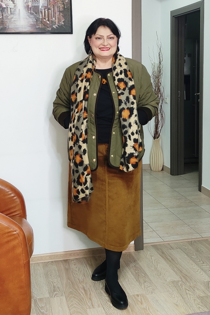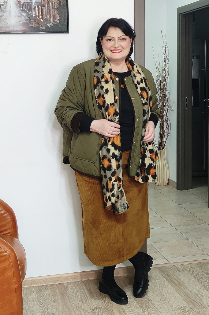 Eu am ales o jachetă kaki nu foarte lungă, pe care o port cu mânecile suflecate, pentru un aspect mai tineresc.