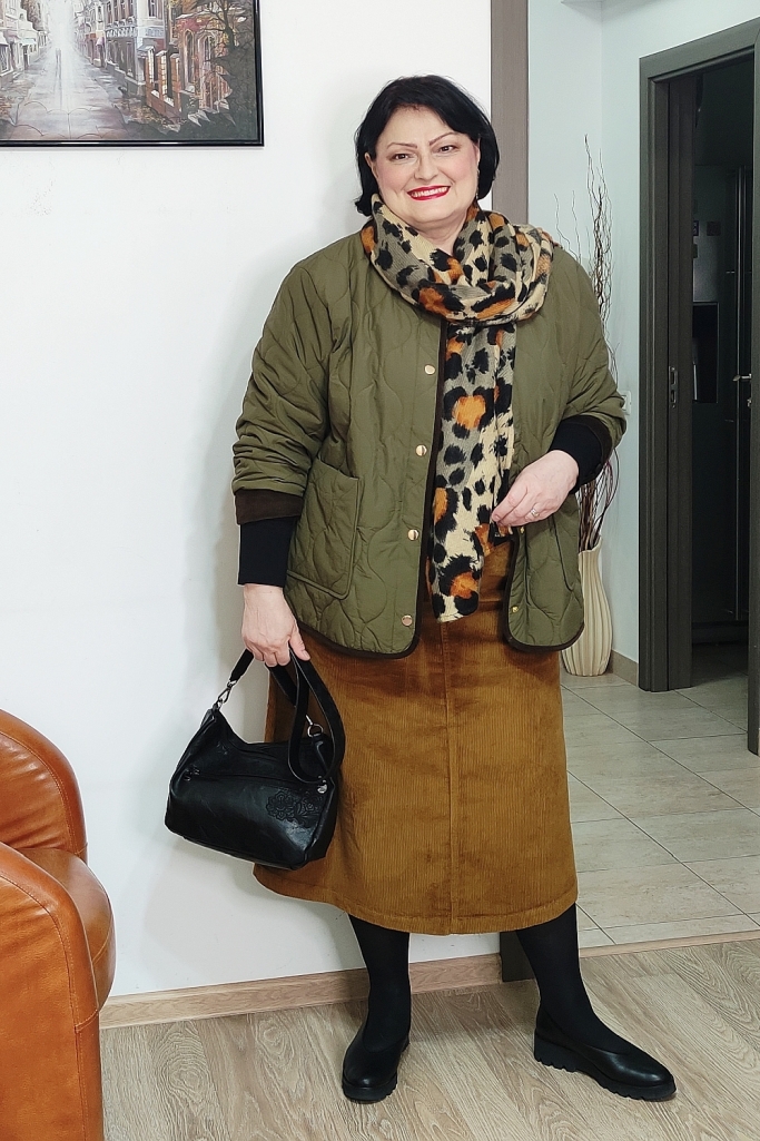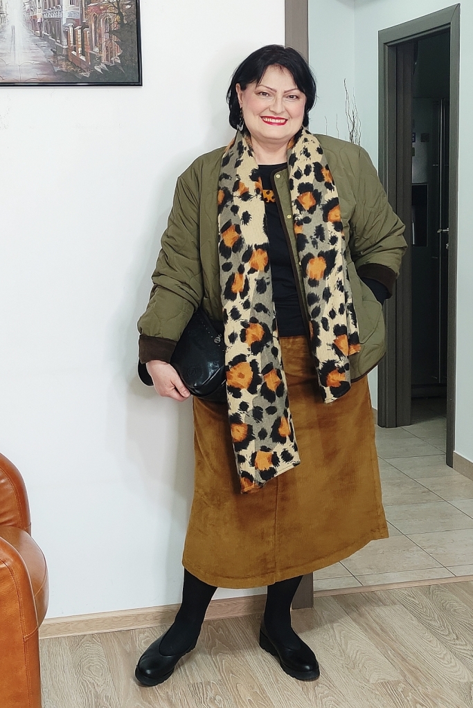 Eu am ales un fular cu animal print, pentru că cromatica sa era exact cea pe care mi-o doream, potrivită cu fusta şi jacheta. Dar poate fi şi un fular în carouri, cu dungi sau uni, într-o culoare frumoasă şi asortată ţinutei.