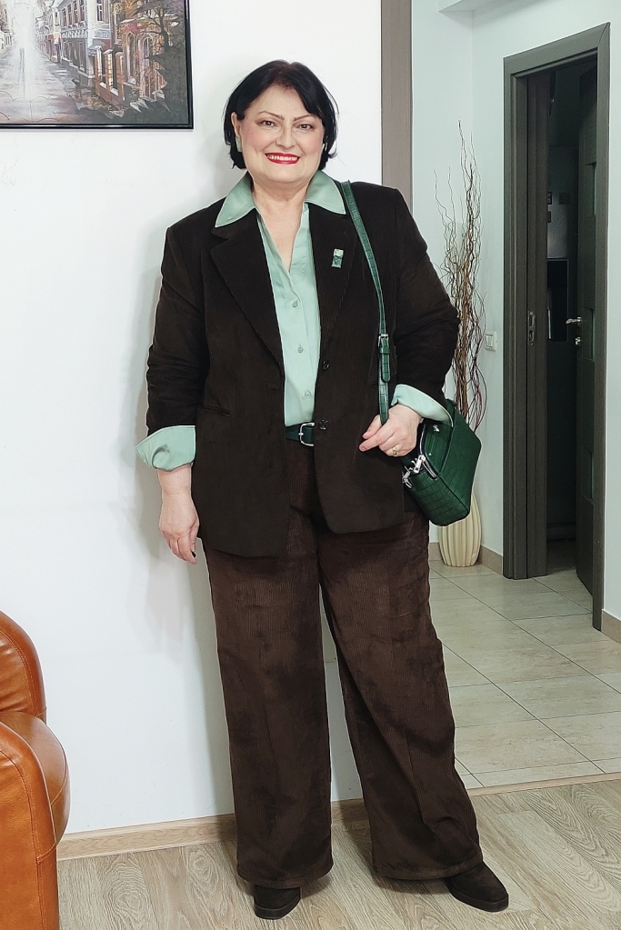 Pantalonii și sacoul din catifea reiată maro formează o bază solidă, coerentă, cu un aer ușor clasic, dar deloc rigid.
