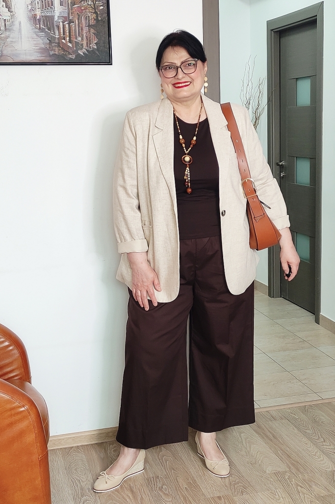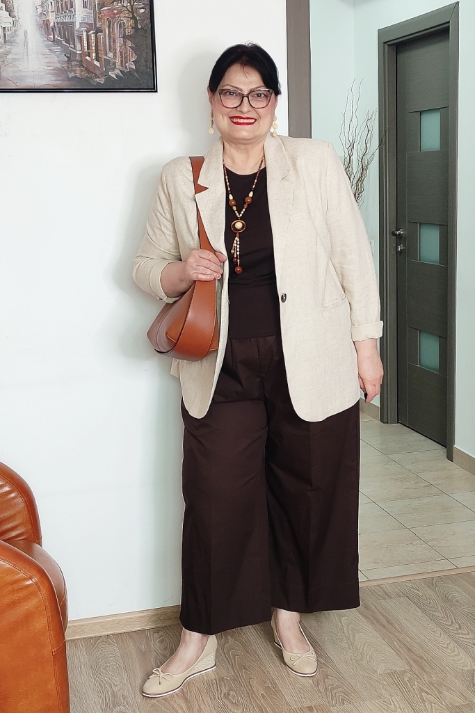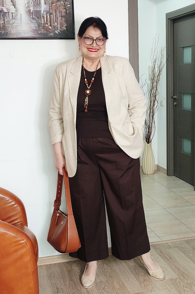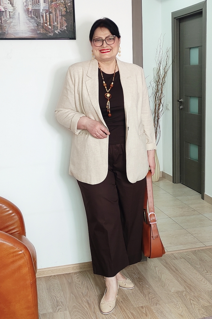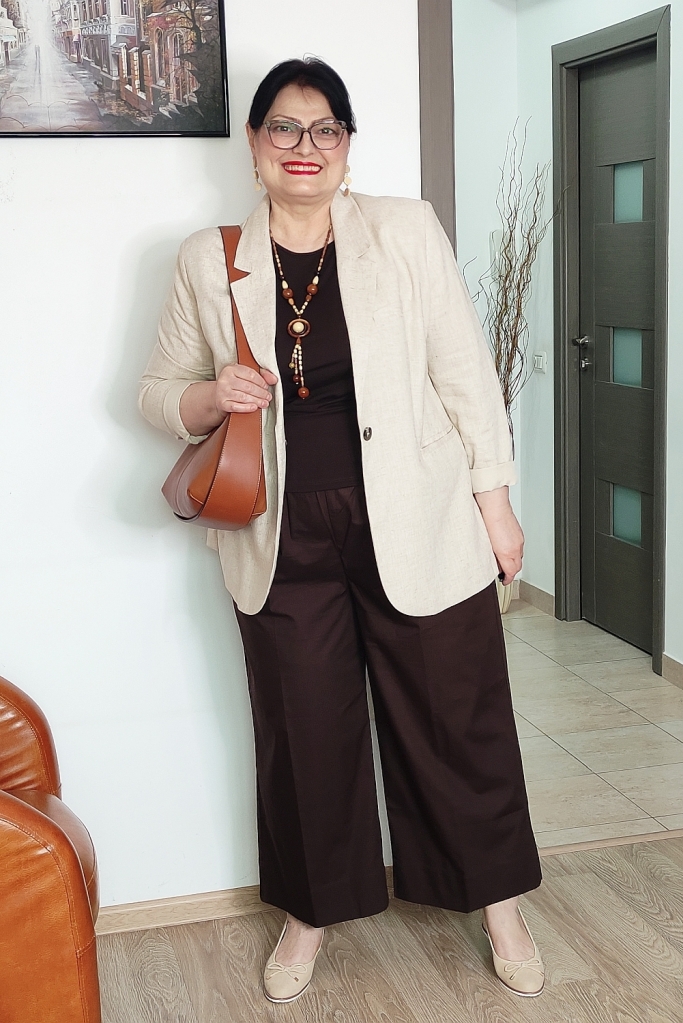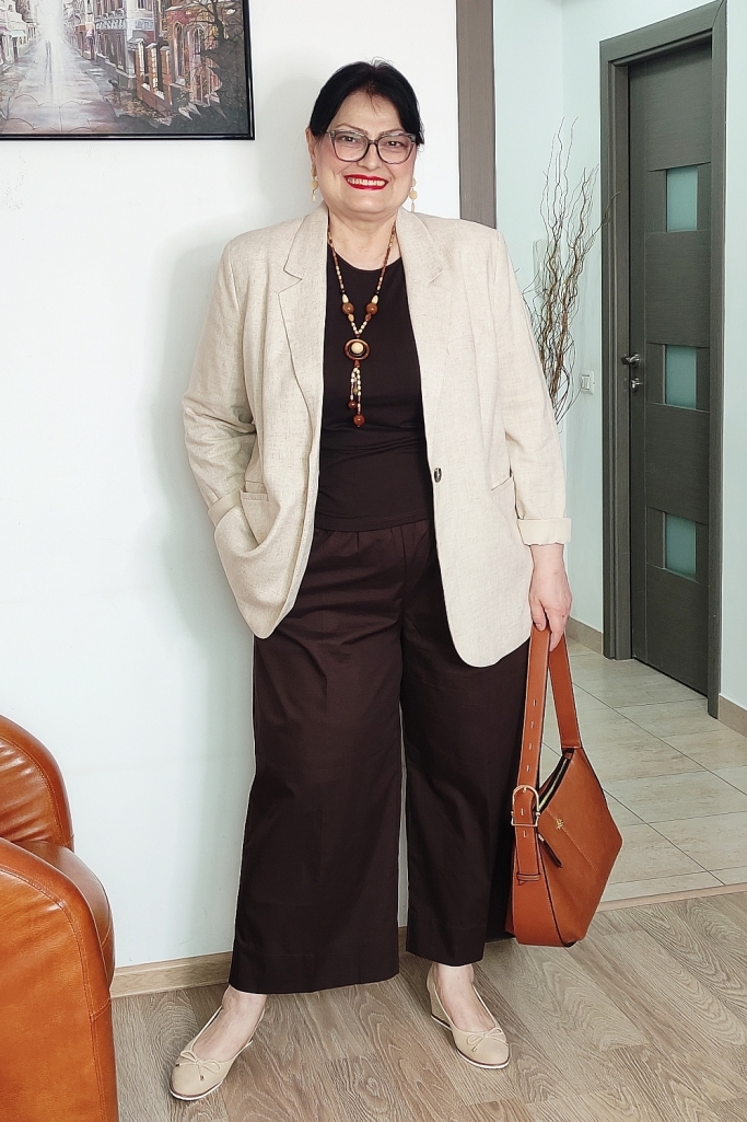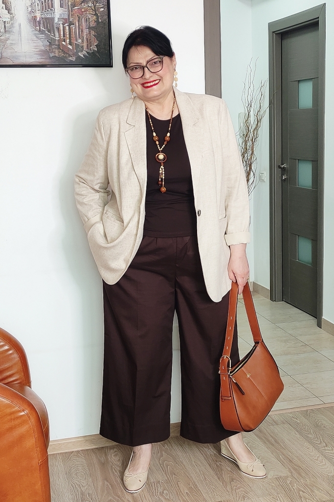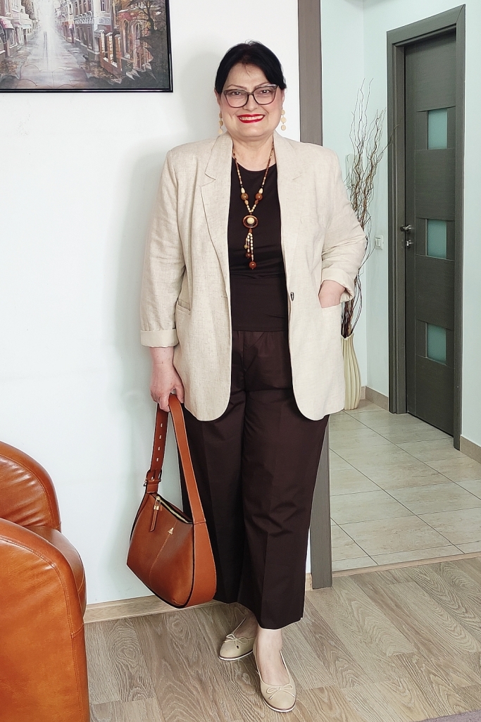 Pentru a „deschide” ținuta și a-i conferi acel aer primăvăratic, am ales un sacou din in, de culoare bej deschis. Sacoul cu o croială relaxată nu doar că structurează silueta, dar neutralizează greutatea maroului, aducând un plus de rafinament.