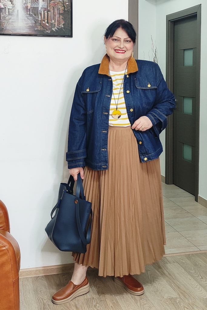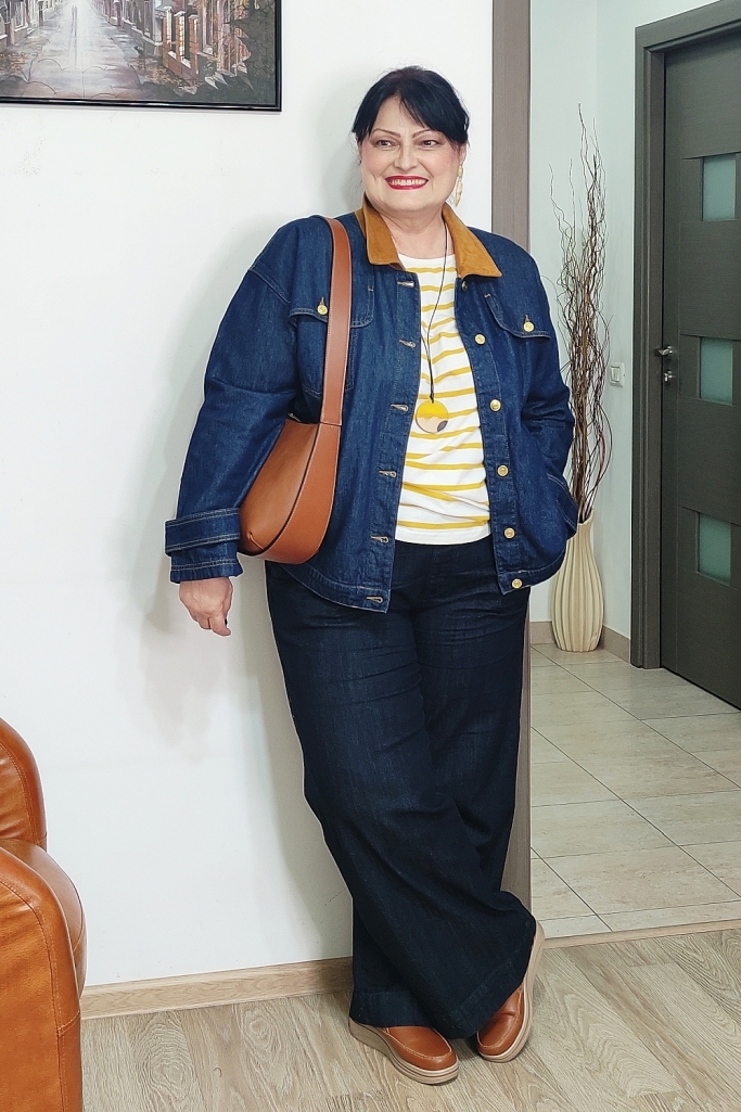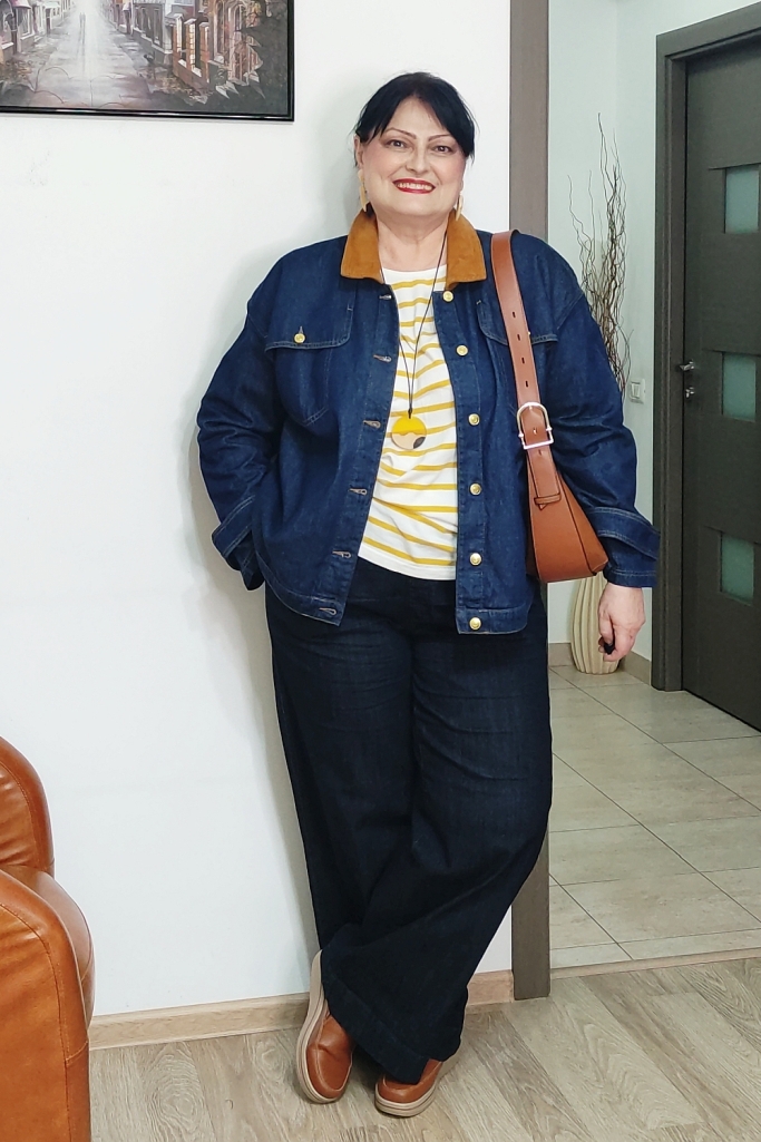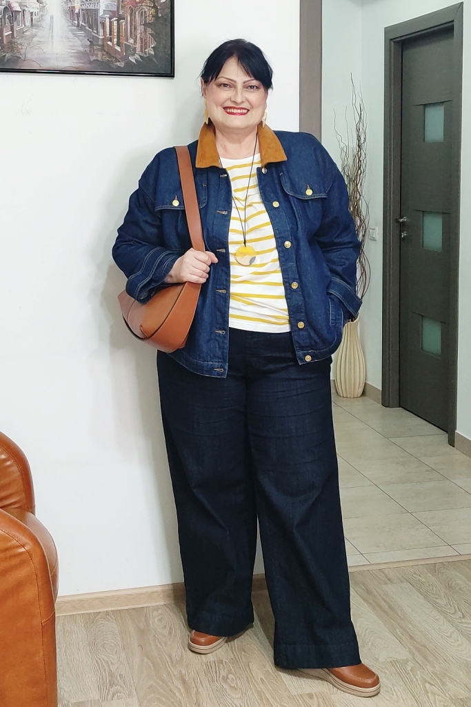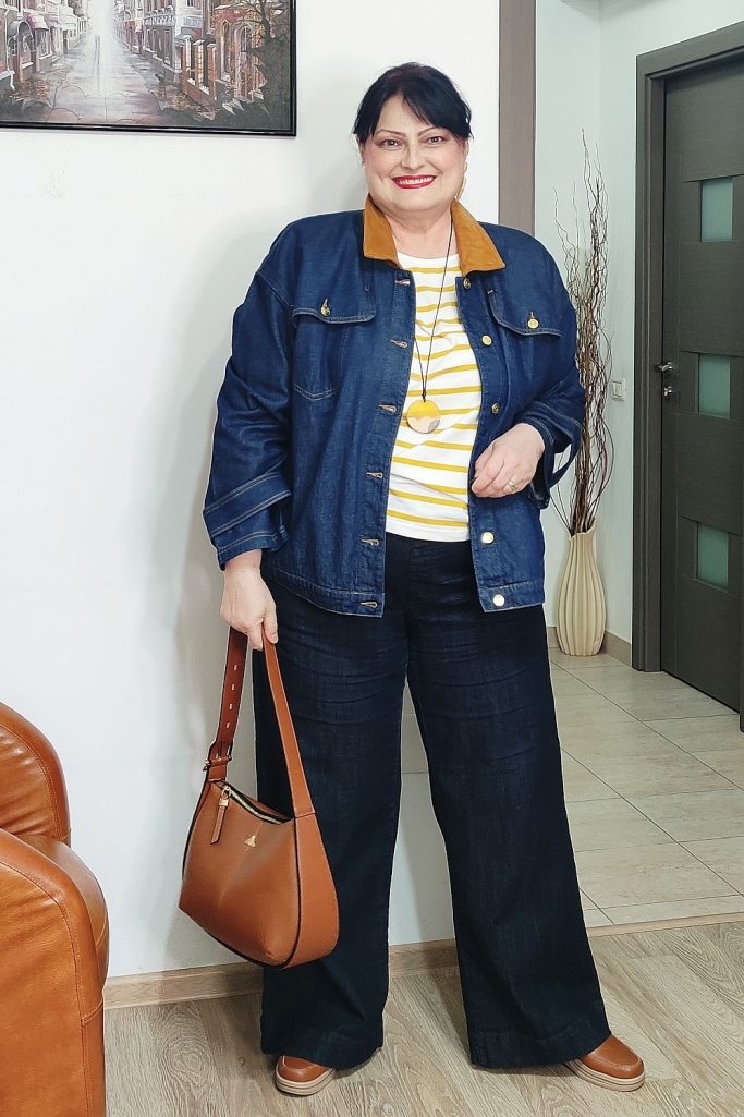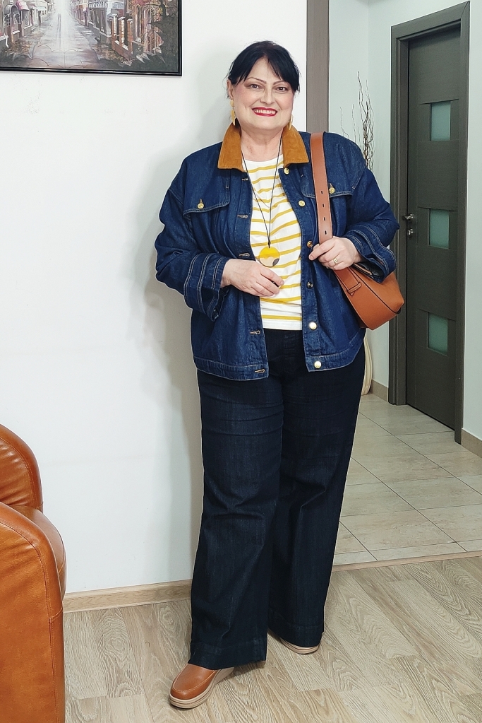 Pe sub jachetă am îmbrăcat un tricou cu dungi galbene care luminează ansamblul şi oferă un contrast cu nuanţele închise ale denimului. Pantofii şi geanta maro coniac completează ţinuta şi se leagă vizual de nuanţa gulerului jachetei.