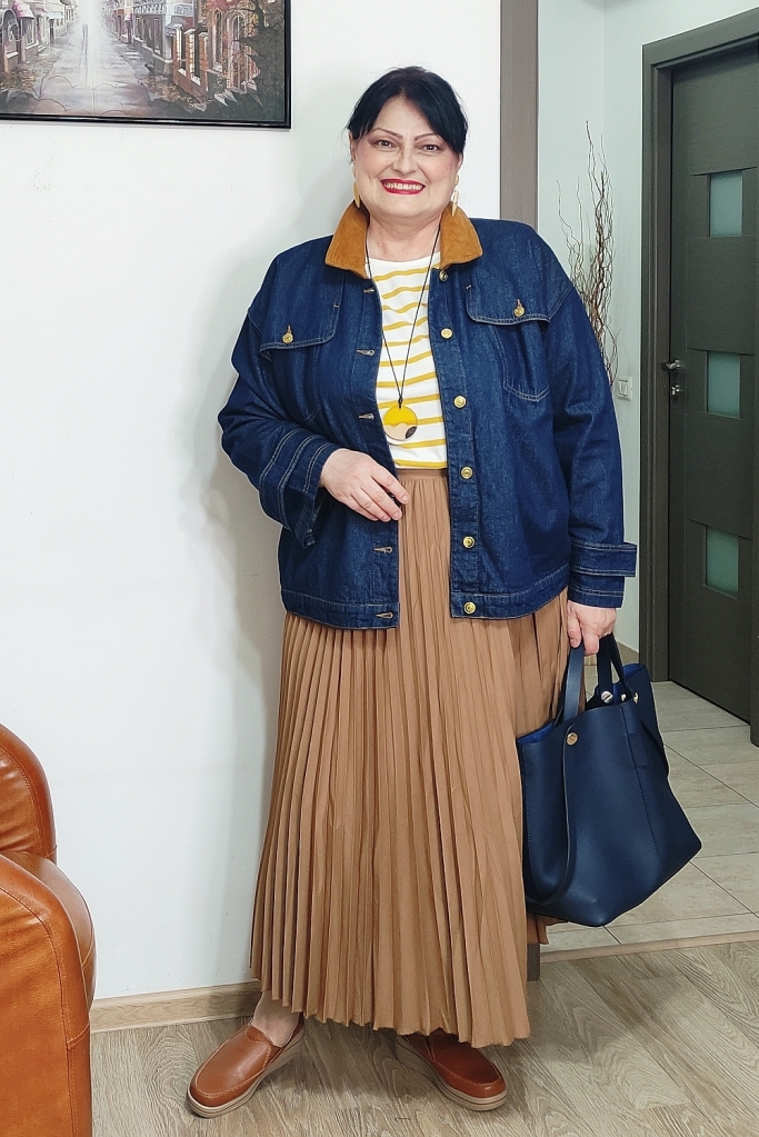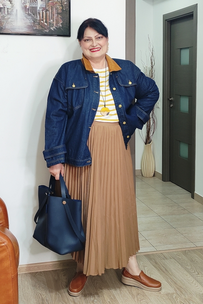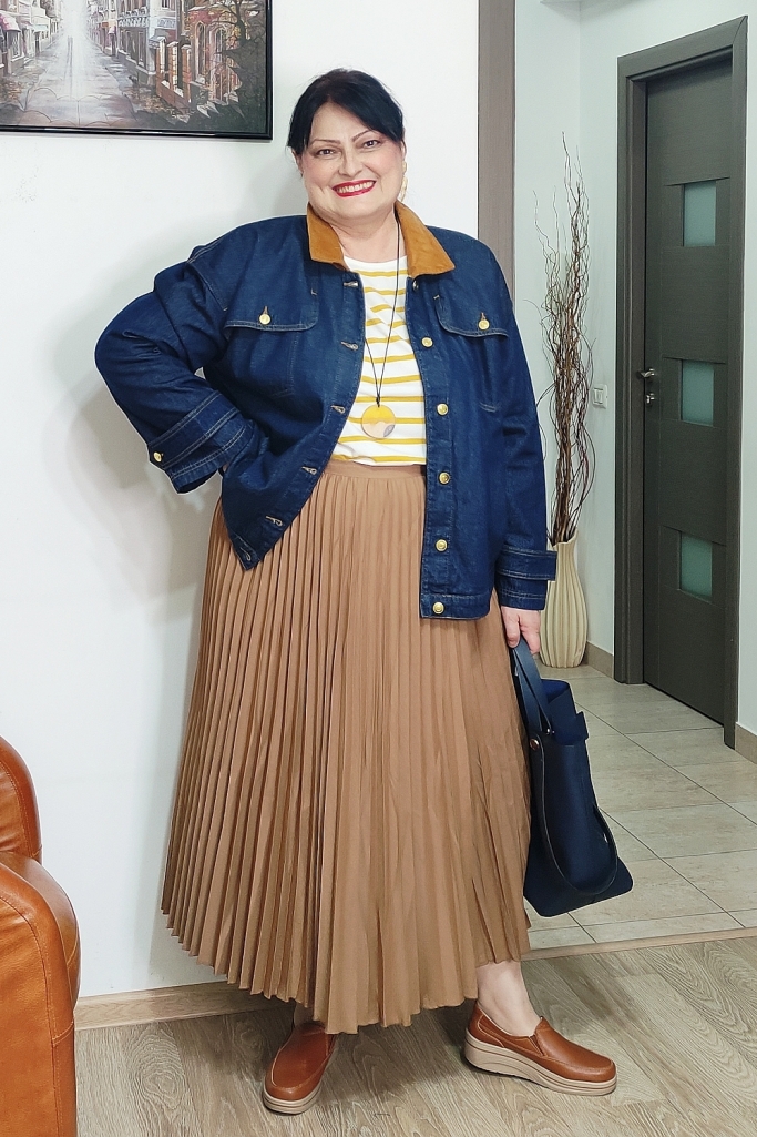 În cea de-a doua ţinută am păstrat tricoul cu dungi galbene dar am schimbat blugii cu o fustă plisată maro camel, care conferă ansamblului o notă feminină chic.