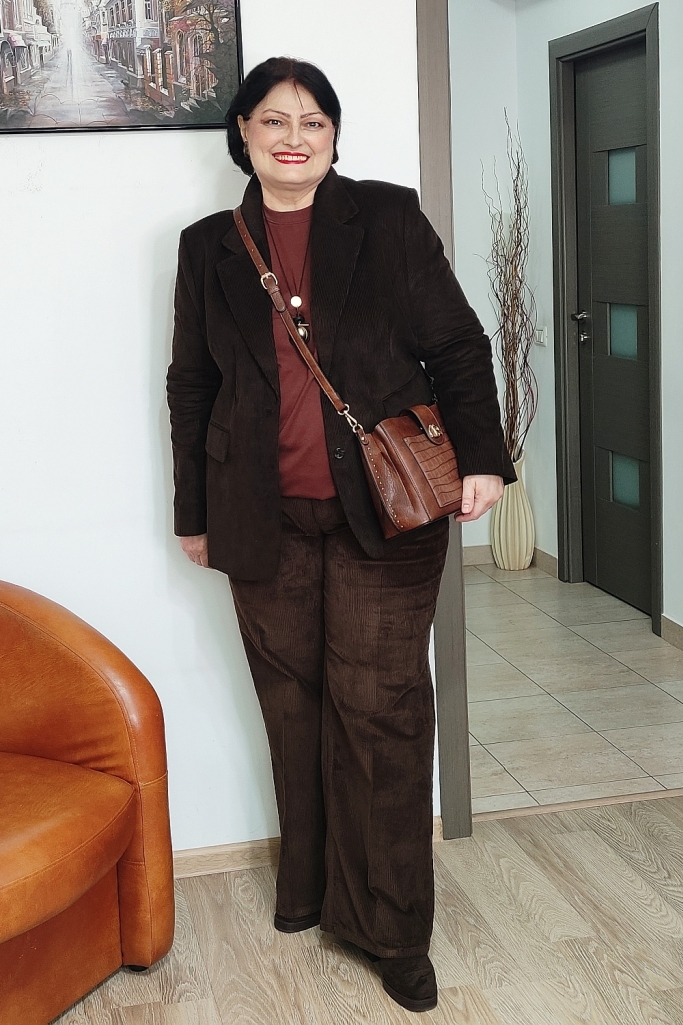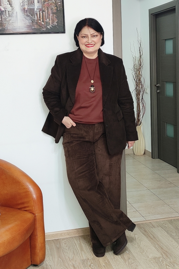 Pantalonii sunt tot de catifea reiată, un ton mai deschis, ca o ciocolată cu lapte.