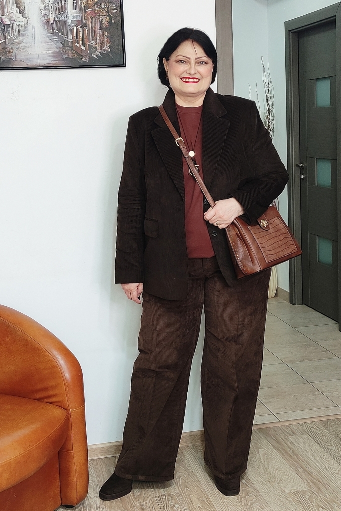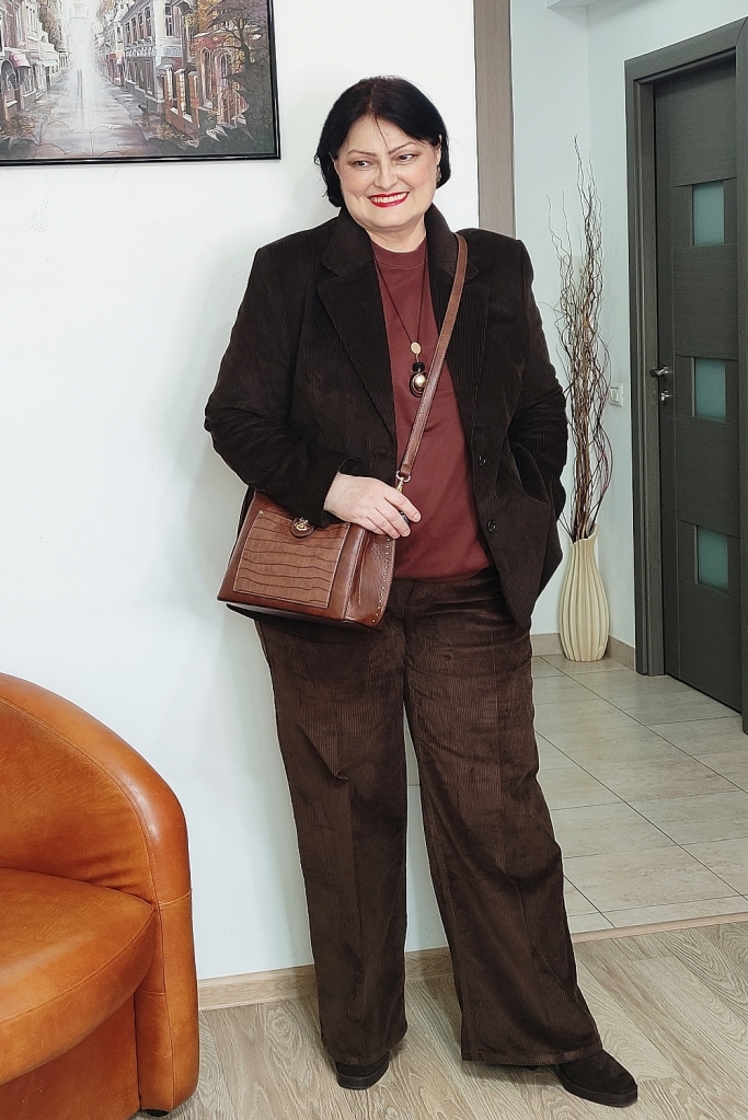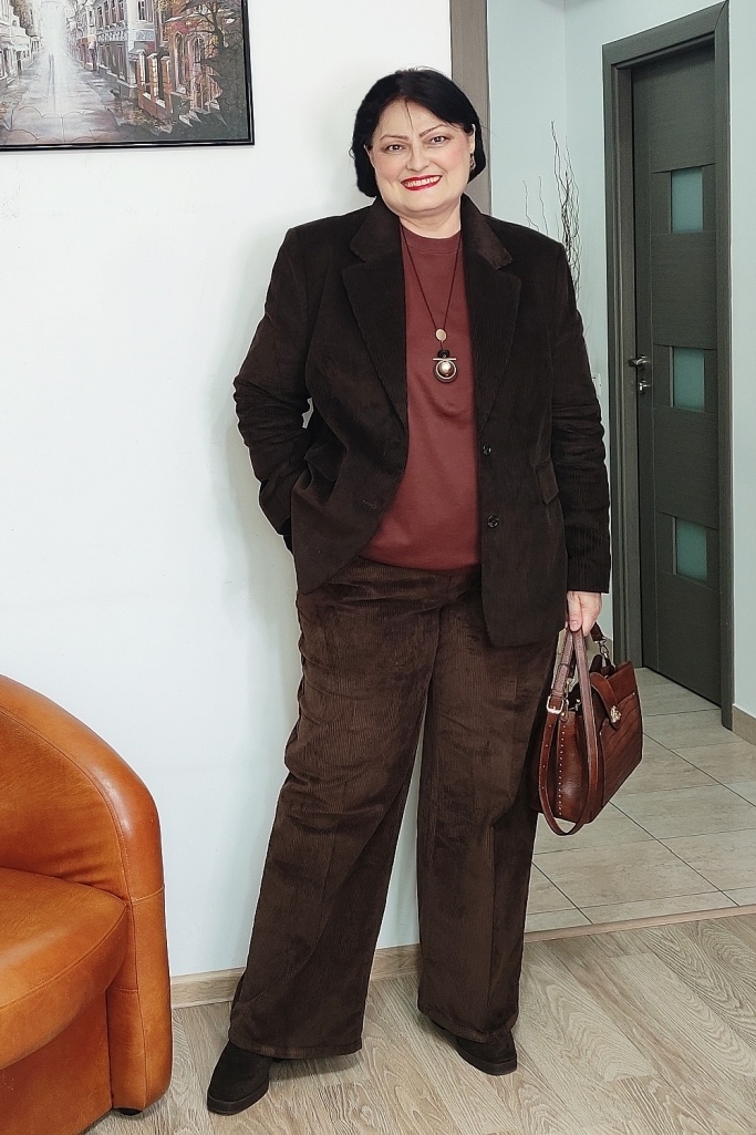 Am purtat un sacou maro închis de catifea reiată, într-o nuanţă asemănătoare ciocolatei amărui.