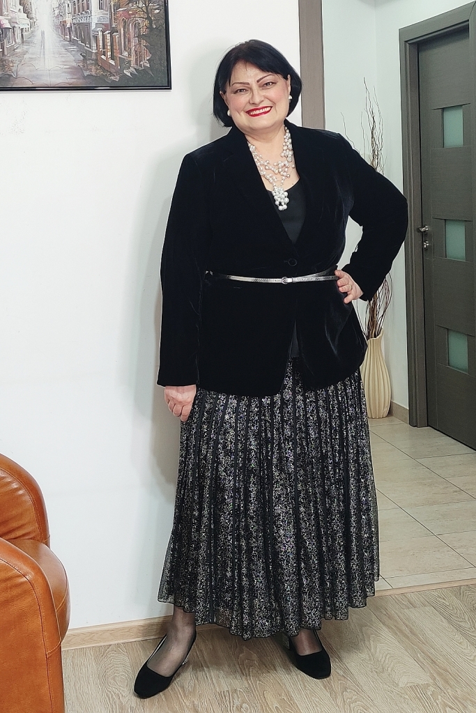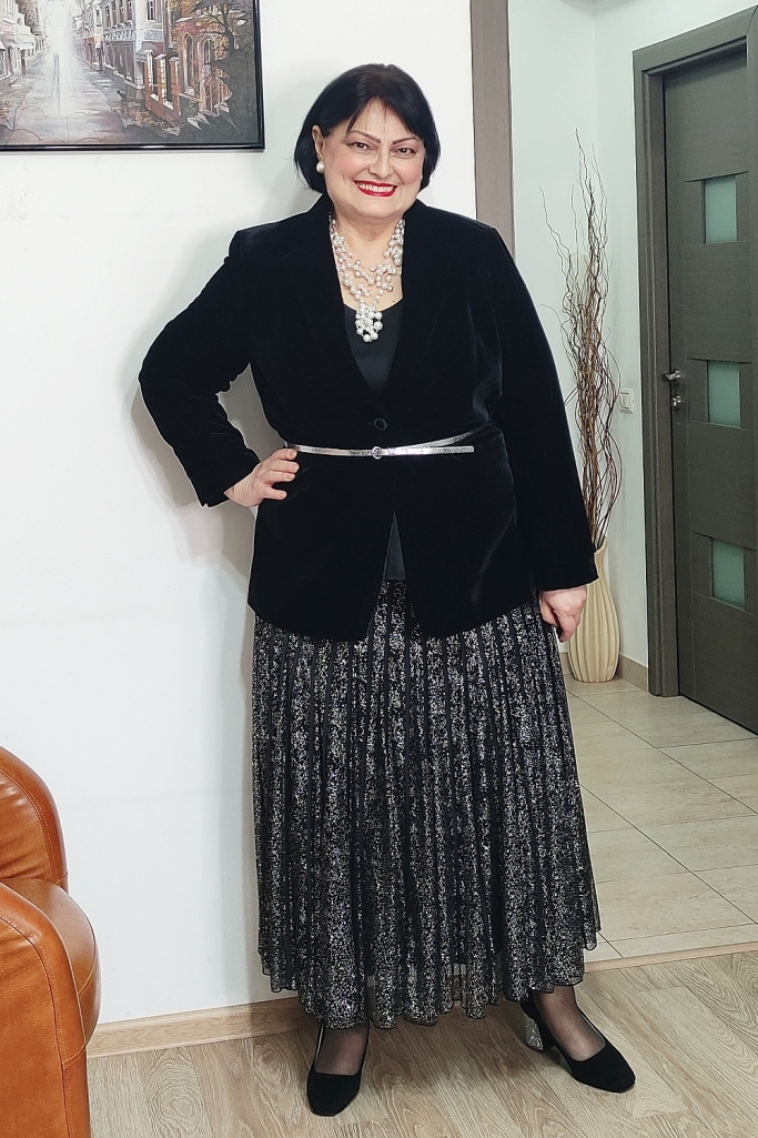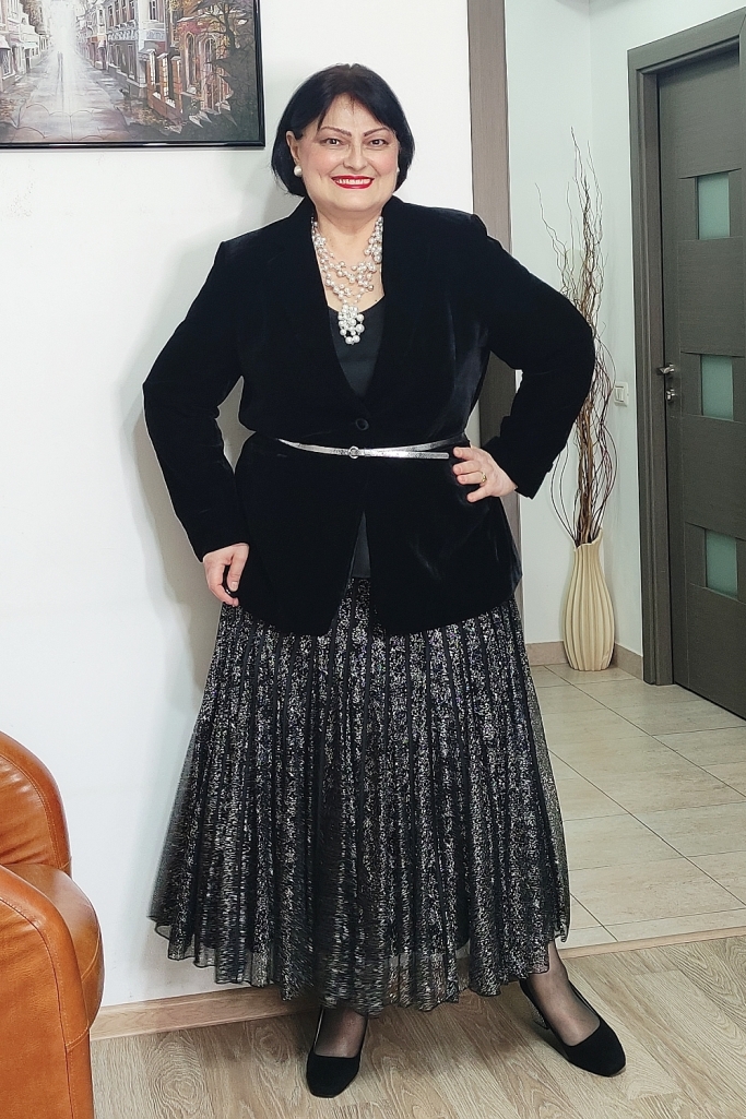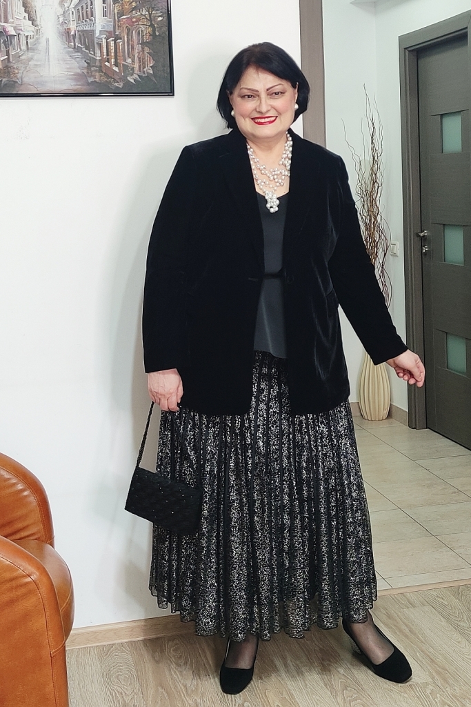 Am obţinut astfel, o fustă fabuloasă, din voal negru cu accente argintii, pe care o port cu un top negru de satin şi un sacou de catifea de un negru profund.