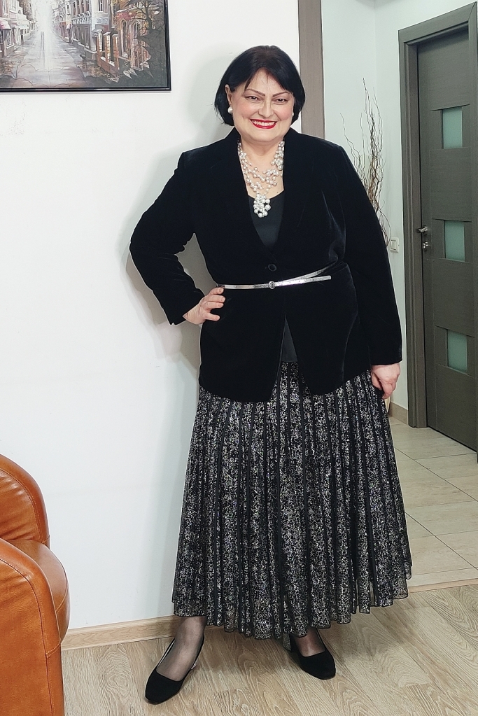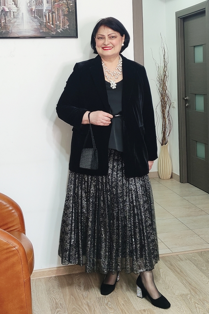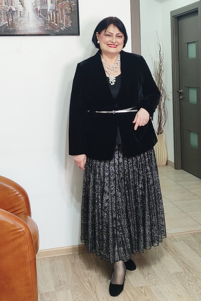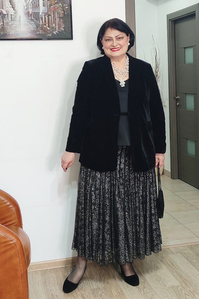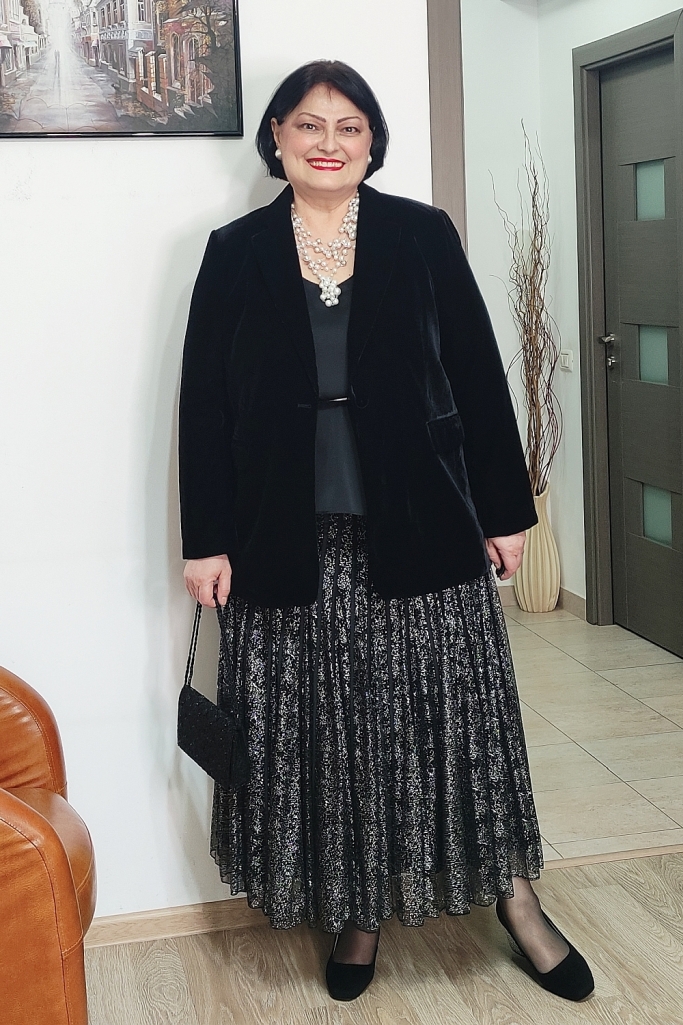 Am obţinut astfel, o fustă fabuloasă, din voal negru cu accente argintii, pe care o port cu un top negru de satin şi un sacou de catifea de un negru profund.