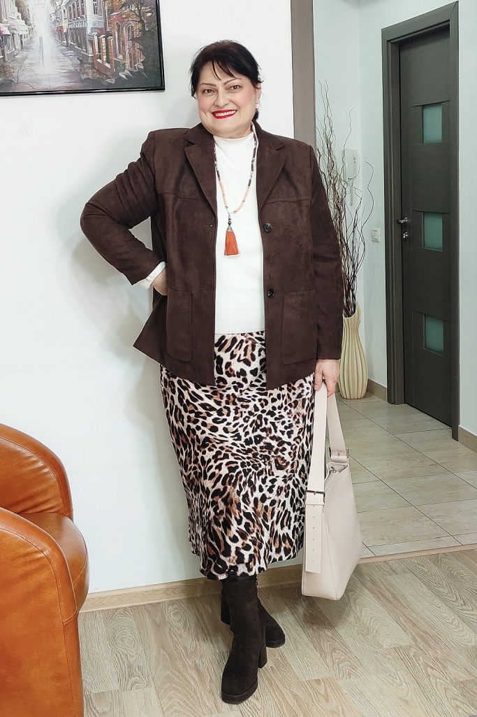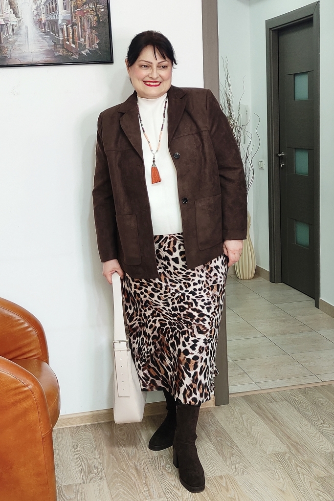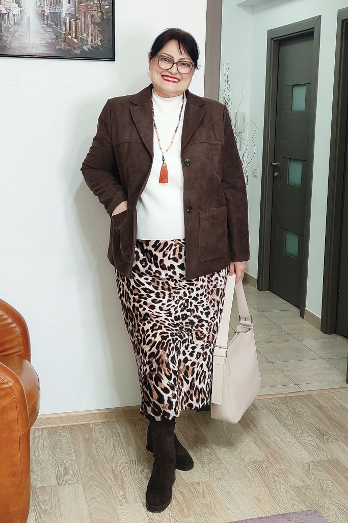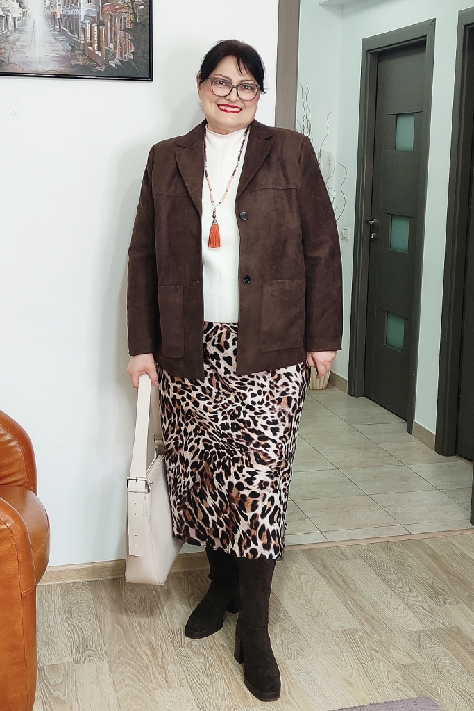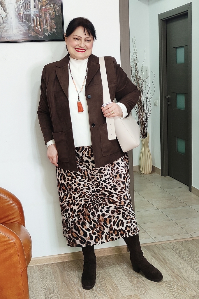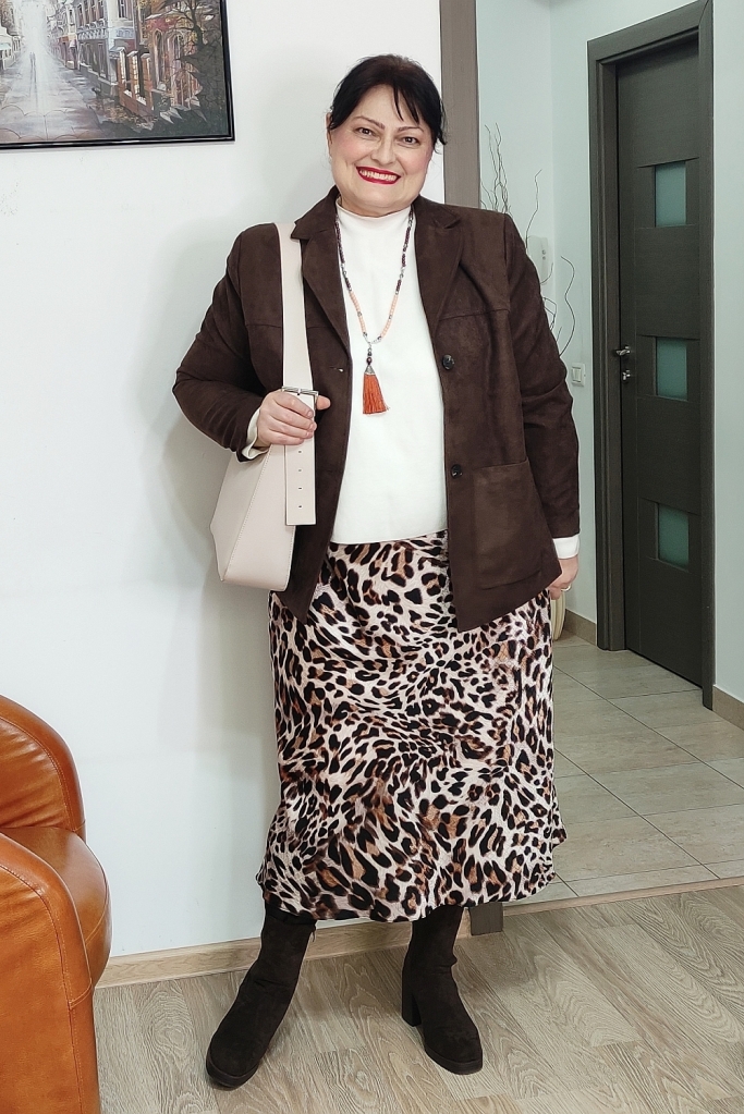 În partea de jos am ales o fusta din satin cu animal print, care prin linia feminină şi imprimeul îndrăzneţ creează un contrapunct stilistic la liniile bine definite ale jachetei.