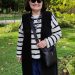 O port peste un pulover alb, simplu şi luminos, ce echilibrează cromatic ansamblul şi aduce un contrast rafinat cu nuanţa ciocolatie a jachetei.