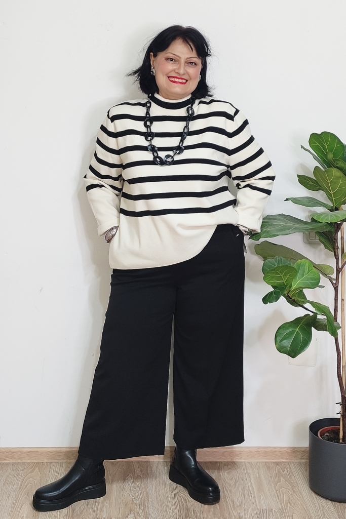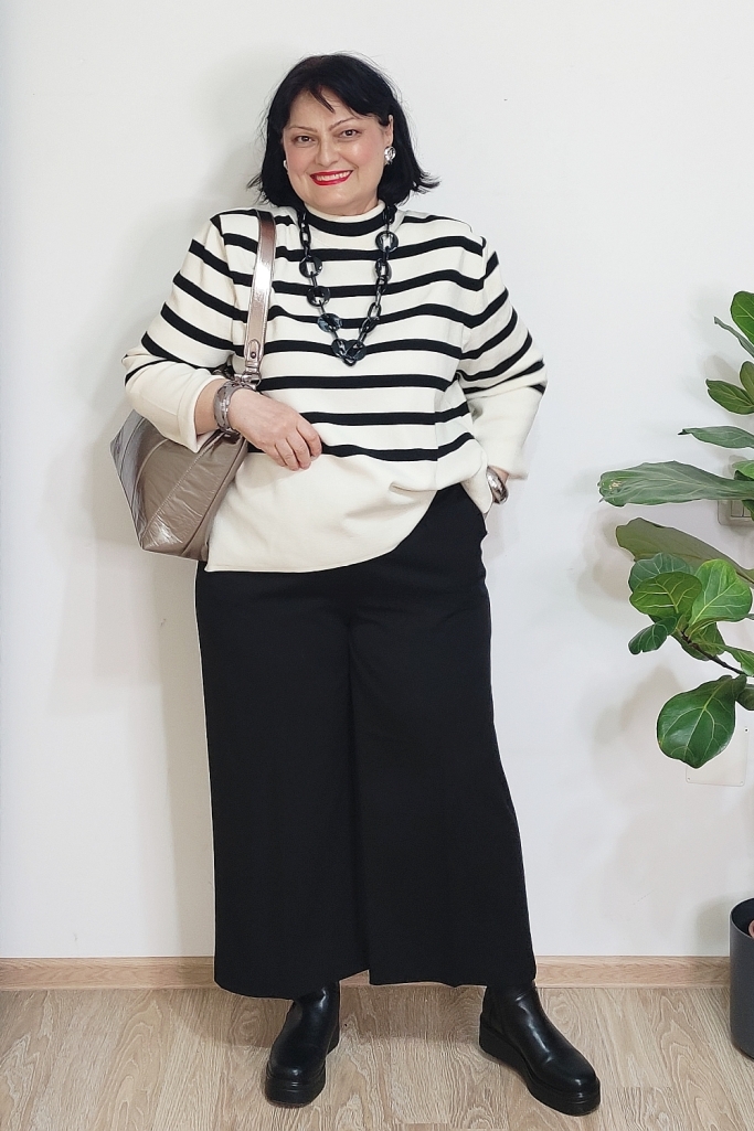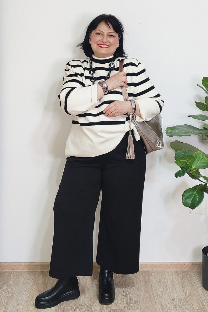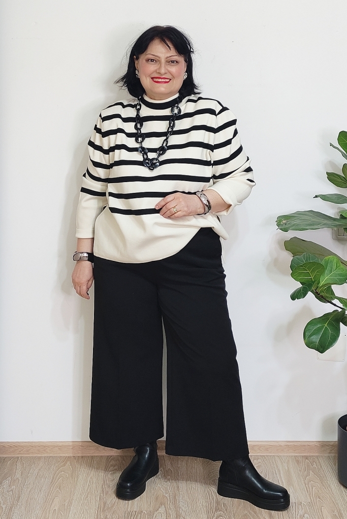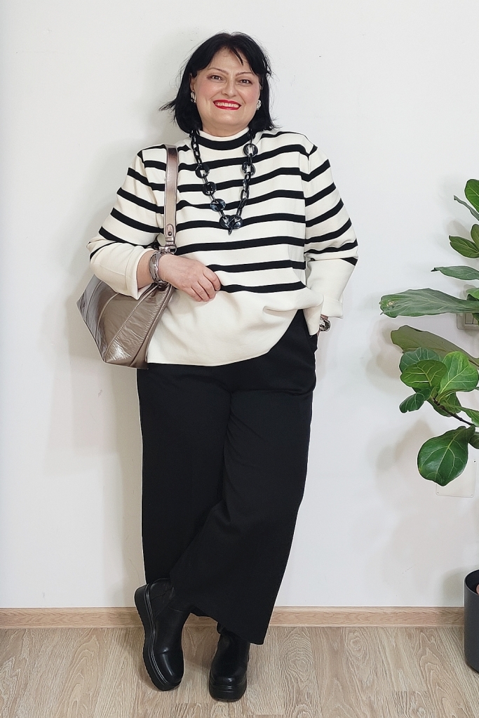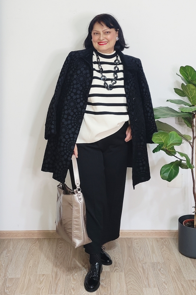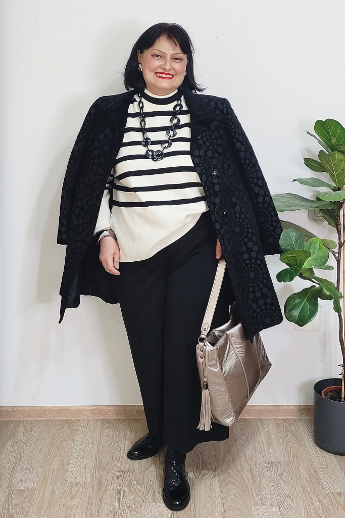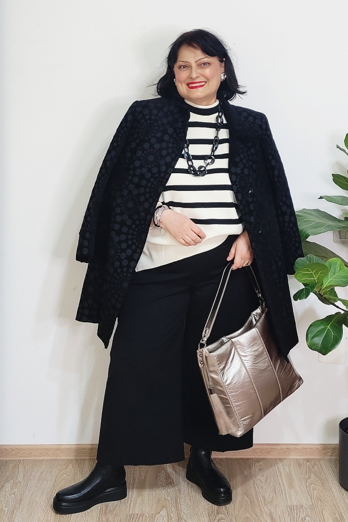Pentru mine, cheia unei ținute de iarnă reușite nu stă neapărat în culori puternice, ci în combinații inteligente de materiale și imprimeuri. Iarna e sezonul perfect pentru stofe bogate, tricotaje fine, materiale cu relief sau finisaje interesante. Când adaug și un contrast clar cum sunt dungile alb-negru, ținuta capătă instant personalitate, fără să devină stridentă.